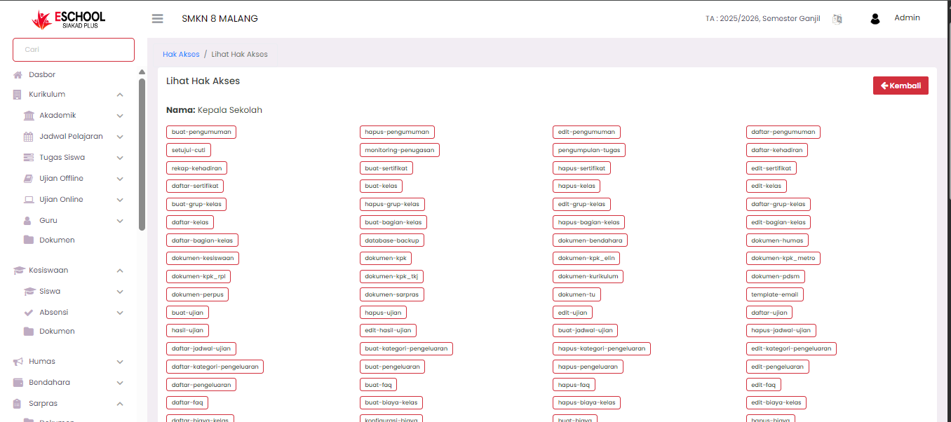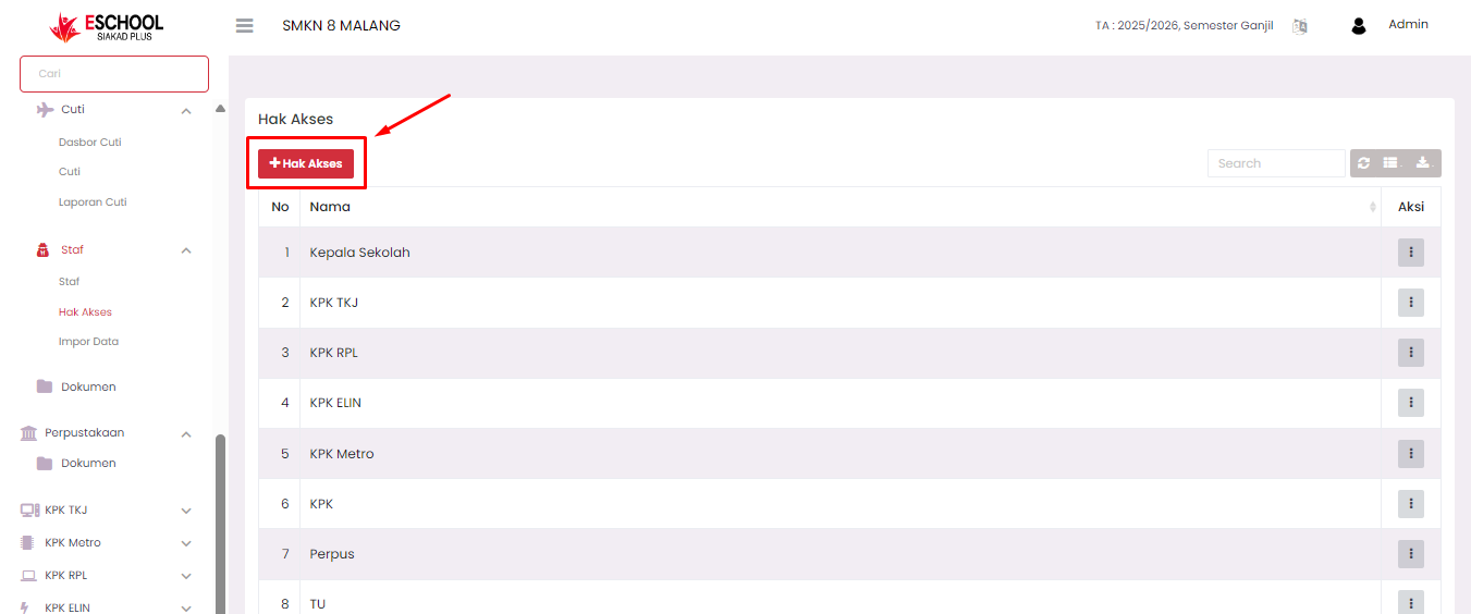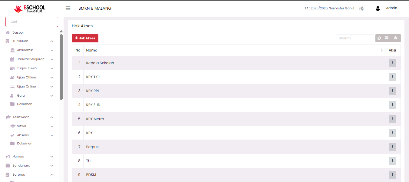 The Access Rights page is used to manage the roles and permissions held by users within the E-SCHOOL SIAKAD Plus system. Through this feature, administrators can create new roles, change existing roles, review access right details, and delete roles permanently.