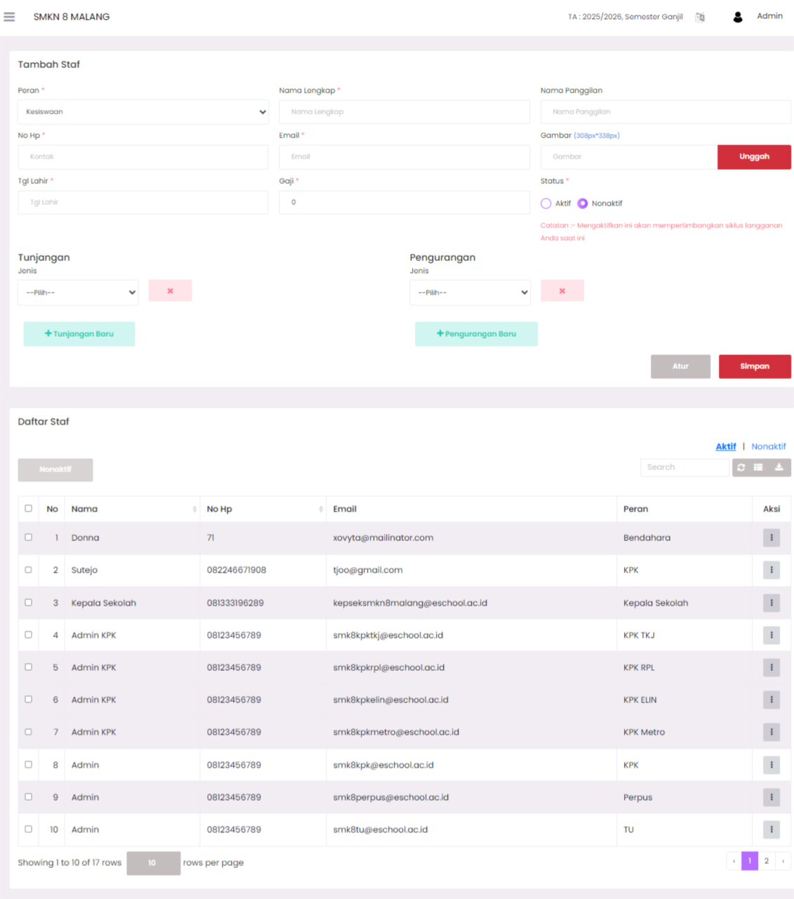 The Staff Management page is used to manage employee or staff data registered within the E-SCHOOL SIAKAD Plus system. Administrators can add new staff, update existing staff information, deactivate staff (soft delete), and manage salary, allowance, and deduction information.