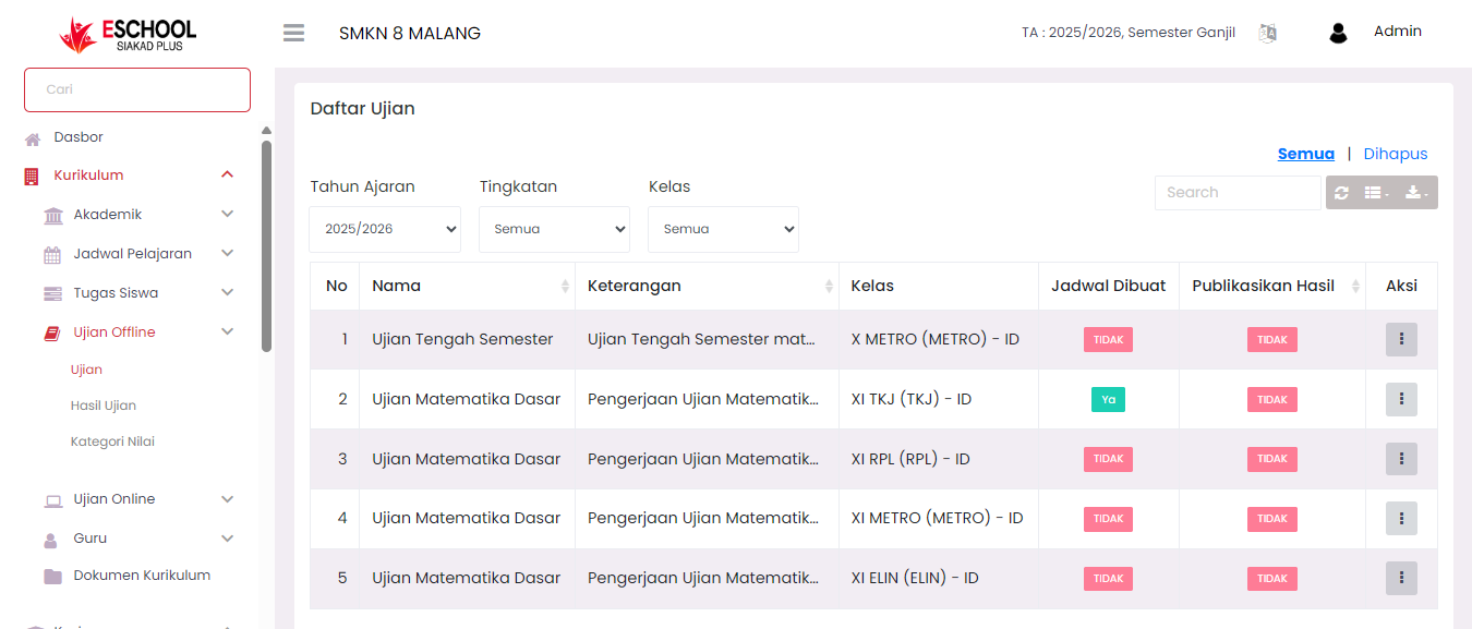 The Offline Exams menu functions as a central management for manual-based (offline) exams conducted at school. Through this page, users can create new exams and monitor the list of exams that have been created for each class.