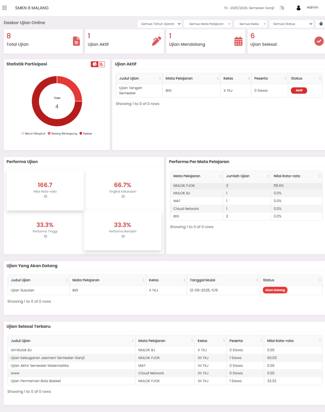 The Online Exam Dashboard is the main display that presents statistical summaries and real-time monitoring of online exam implementation. This page serves as a control center for Admin/Teachers to monitor exam status, student performance, and overall exam activities.
