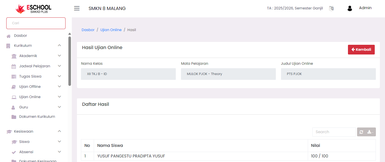 The Online Exam Results menu functions to display a list of scores from online exams that have been completed by students. This page is read-only (for viewing results only), so users cannot make changes to score data on this page.