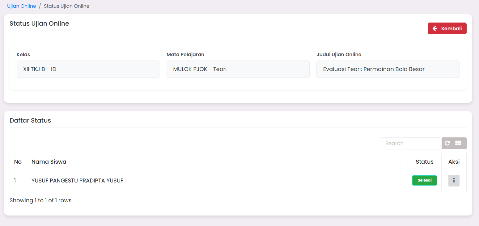 The Online Exam Status feature functions to monitor the exam completion status of students individually. Through this page, admin/teachers can see the list of students taking the exam, and monitor whether the student has completed the exam or not.