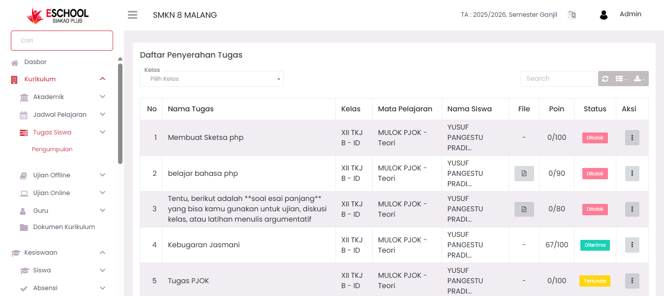 The Assignment Submissions menu functions to display the entire list of assignments that have been completed and submitted by students. This page serves as a control center for teachers to view, check, and provide assessments for these assignments.