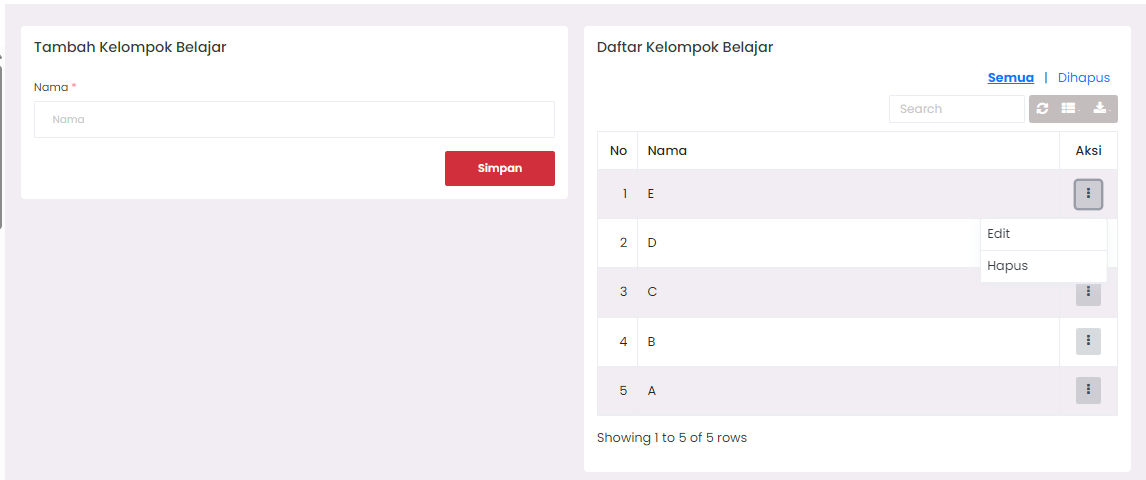 The Study Groups page in eSchool SIAKAD Plus functions to manage data on the division of study groups within each level or major available at the school. This feature is essential as a foundation for scheduling, teacher assignments, and other academic administration.