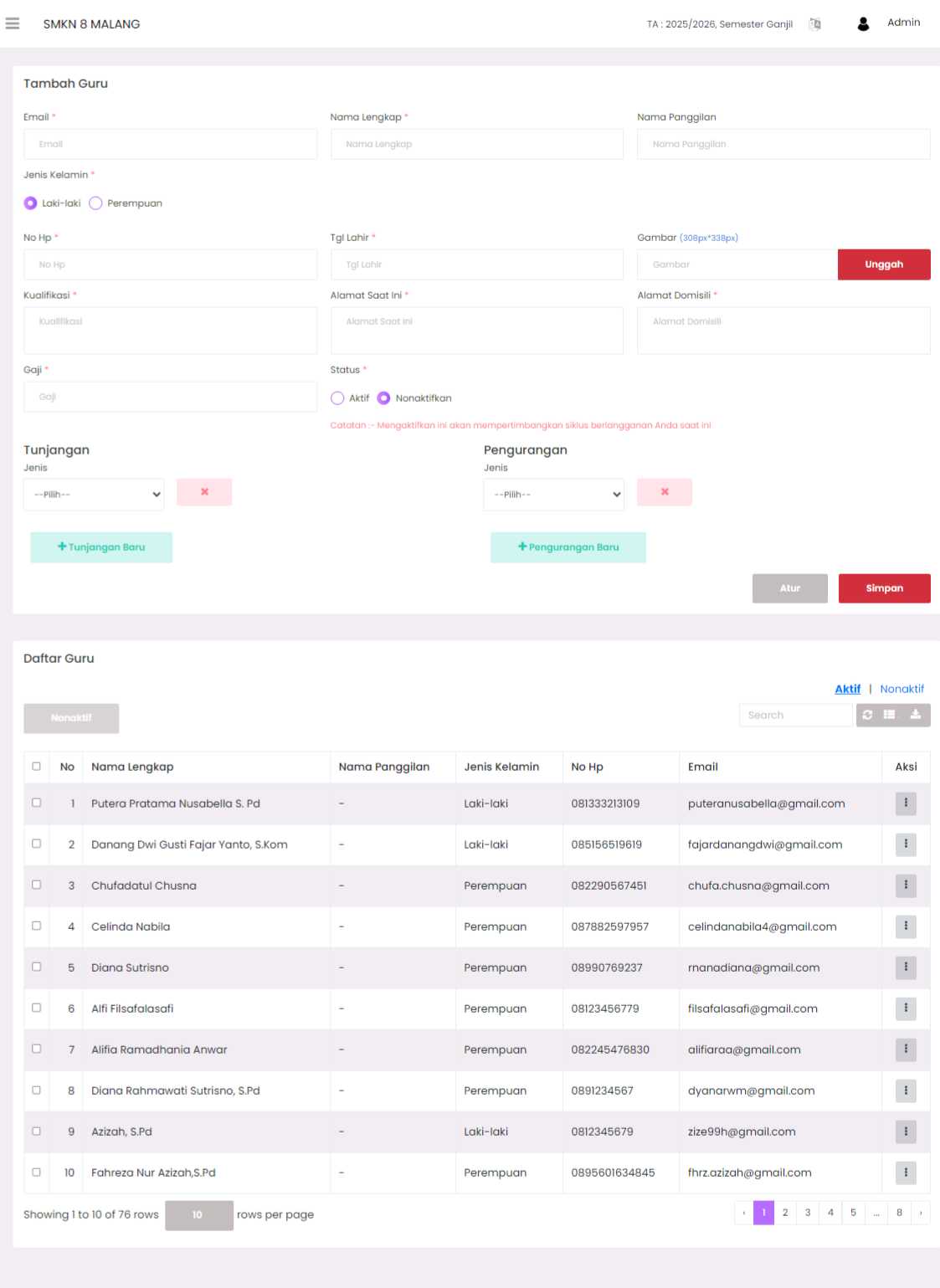 This menu is used to manage teacher data comprehensively, from the process of adding new teachers to managing active and inactive teacher lists. This feature is important to ensure personnel data is always accurate, structured, and ready to be used in various academic and administrative needs.