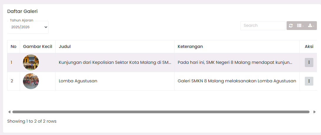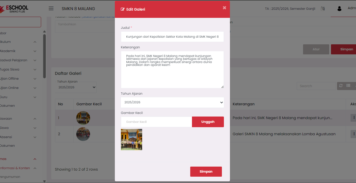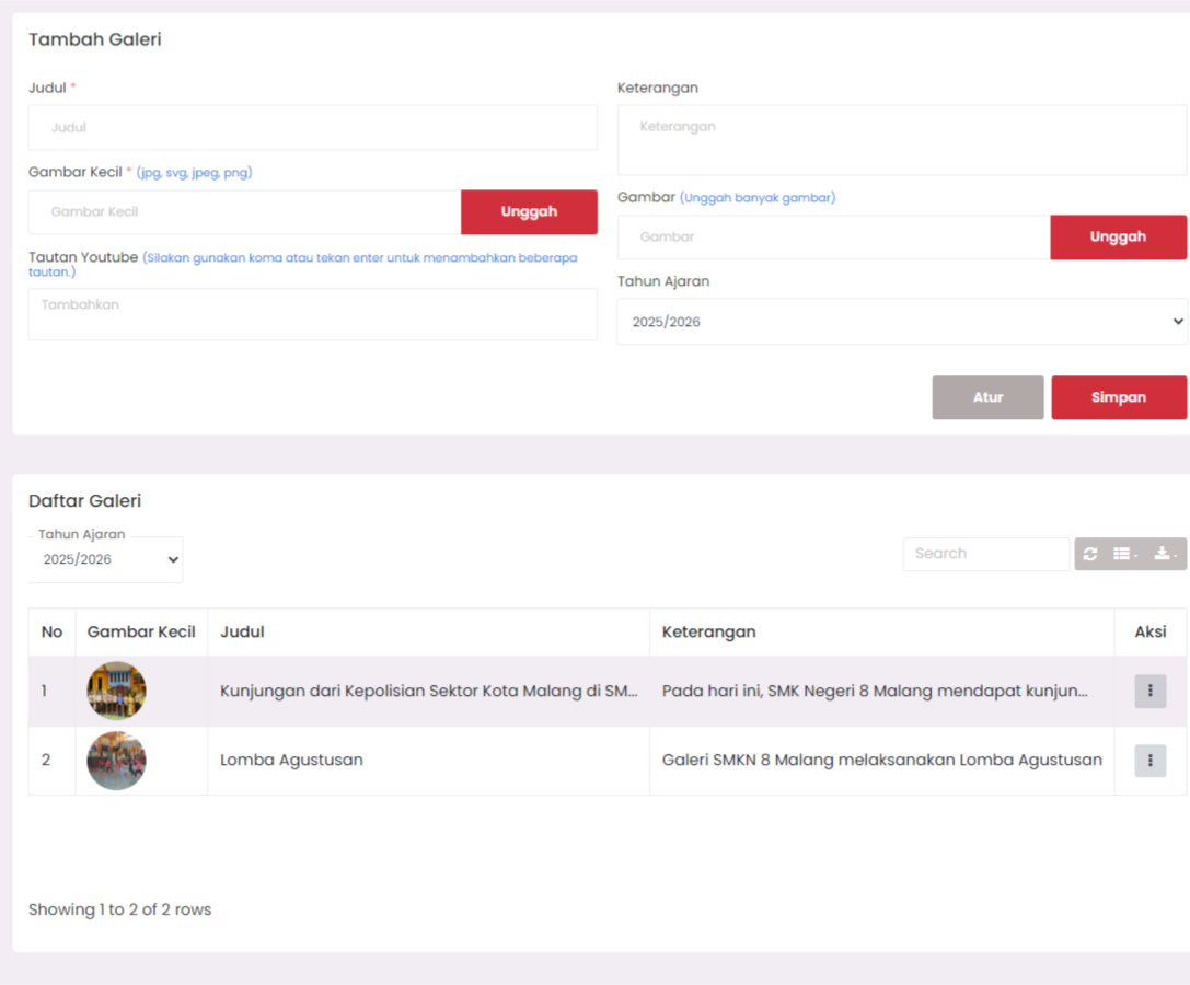 The Gallery feature functions to store school activity documentation in the form of images and videos (YouTube links), accompanied by descriptions and grouping based on the academic year.