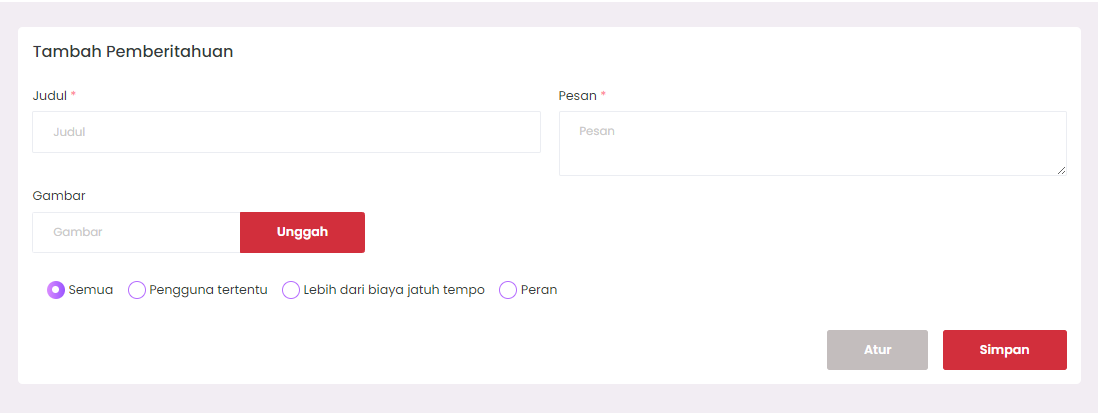 This feature is used by admins to send announcements or notifications to E-SCHOOL system users. Notifications can be addressed to all users, specific users, users with bills, or based on roles.