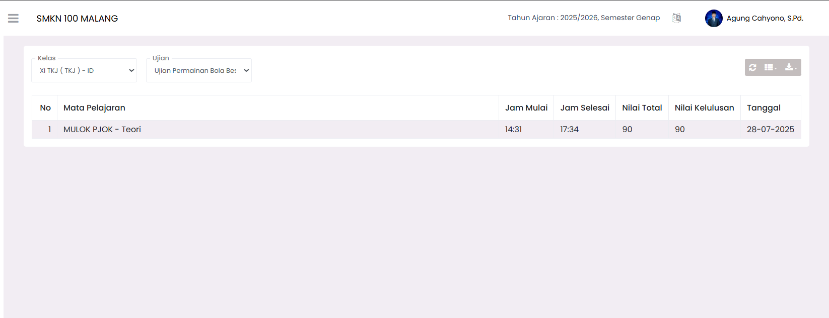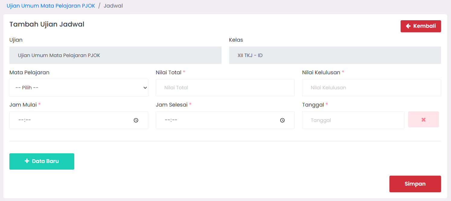 The Offline Exam Schedule page functions to manage the implementation details of previously created exam agendas. At this stage, Teachers determine the specific subject, implementation time, and assessment criteria (maximum score and passing grade).