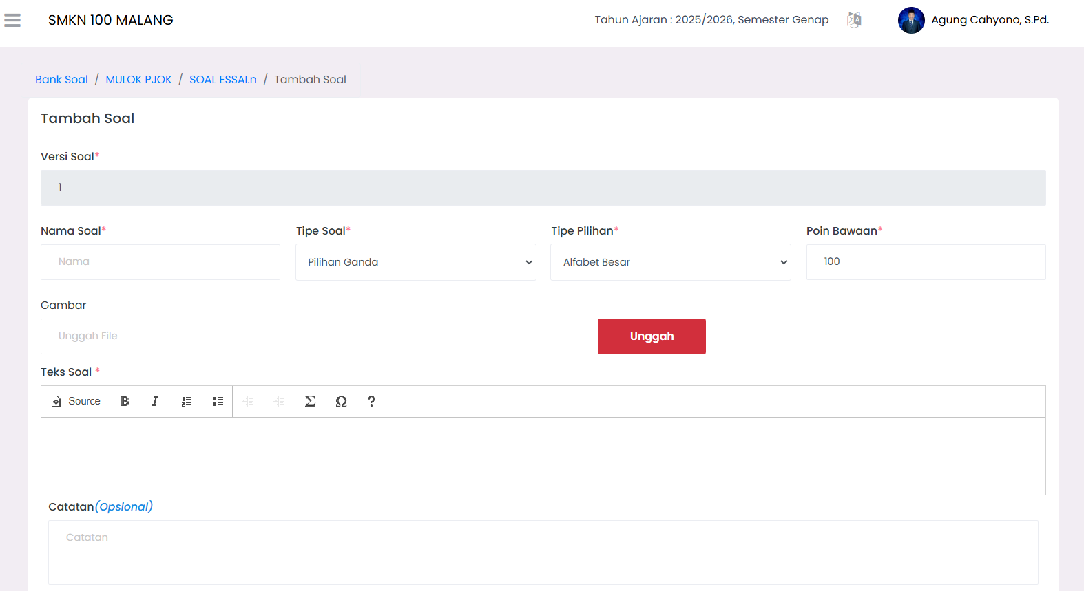 The Add Question page allows Teachers to add new question items to the selected Question Bank container. This is where you define the question type, content, and the corresponding answer options or keys.