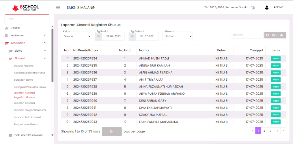 - Attendance Type: Filters data based on attendance status (Present, Sick, Permission, Alpha).