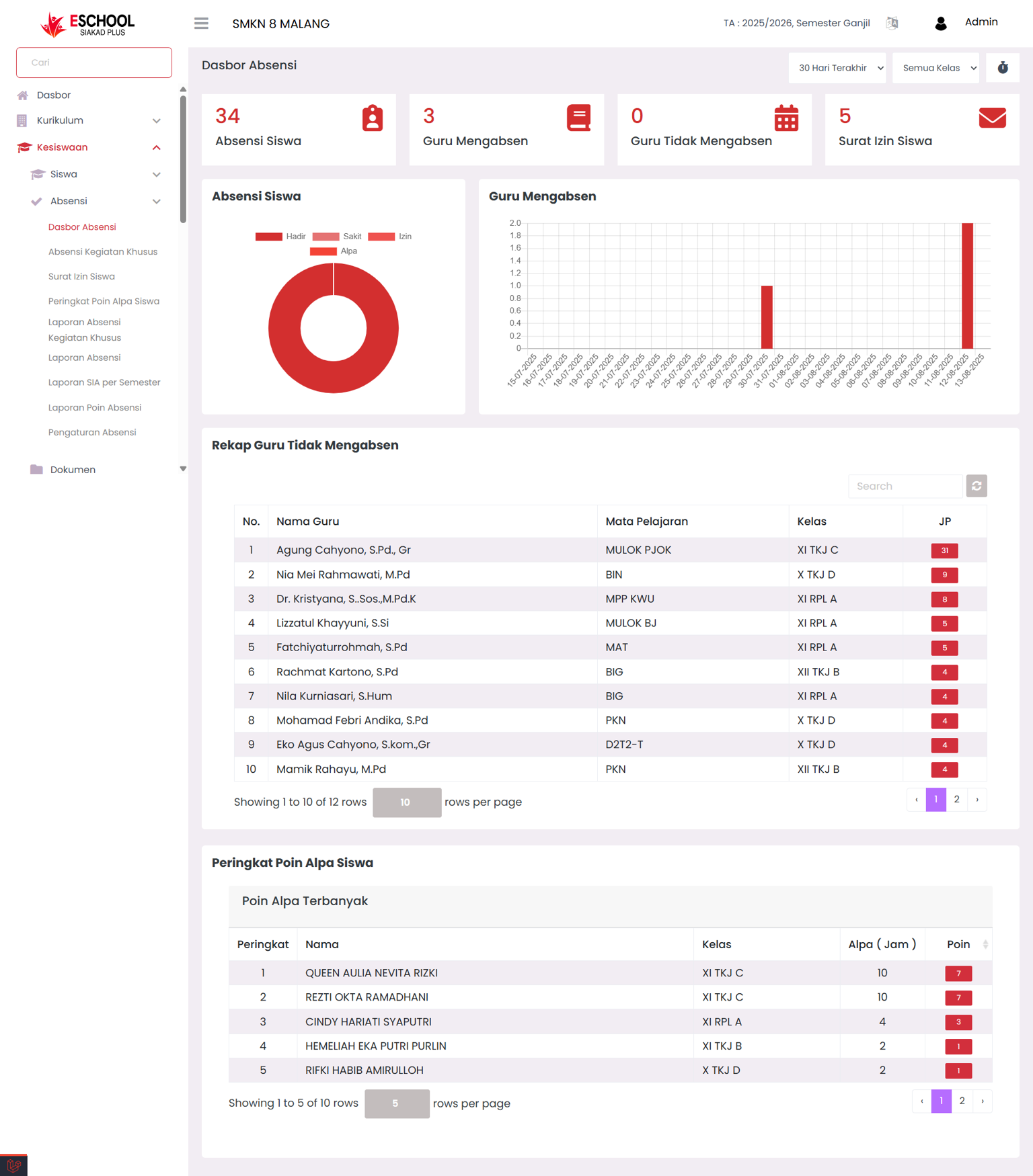 The Attendance Dashboard in eSchool is designed to provide a comprehensive overview of school attendance conditions in one integrated view. The displayed data includes the number of student absences, teachers recording attendance, teachers who haven't recorded attendance, and the number of student leave permits. This information is equipped with visual charts and recap tables so that monitoring can be done quickly, accurately, and in real-time.