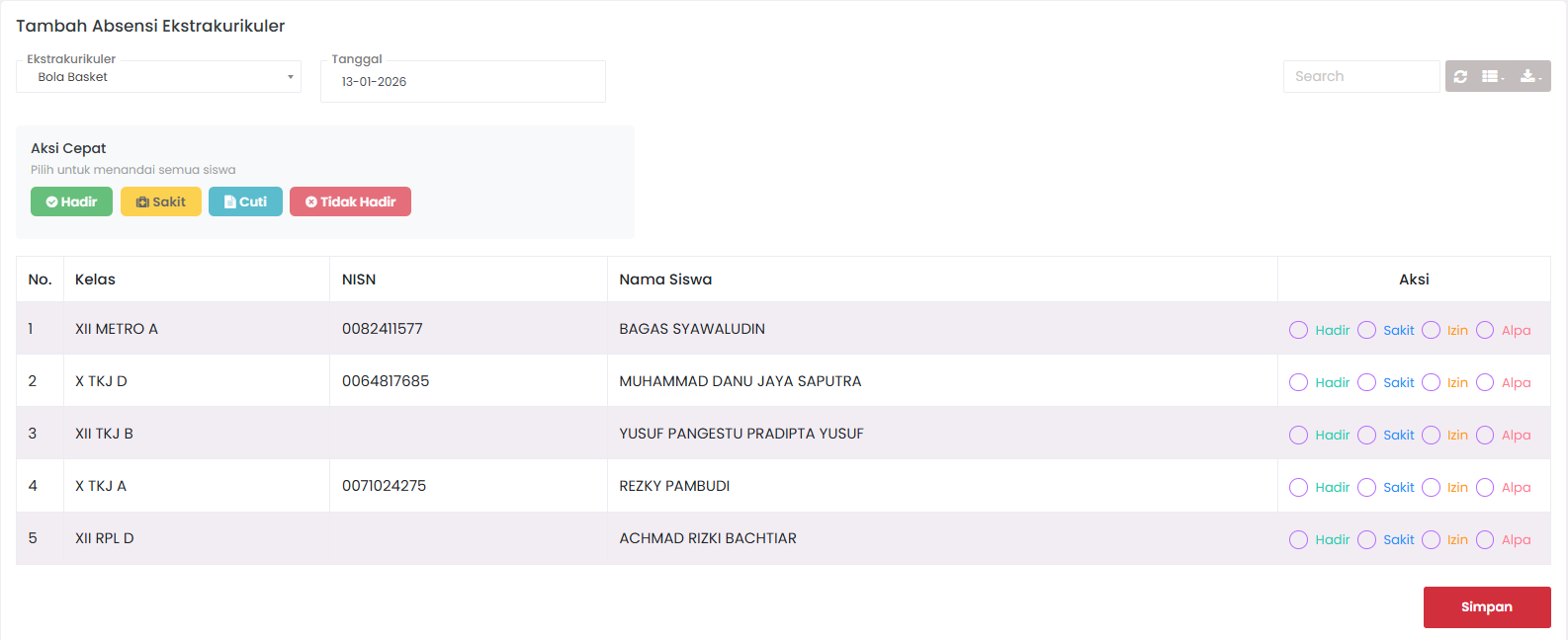 [!TIP] Fastest Way: Click the "Present" button on Quick Action, then manually change it only for the few students who did not come.